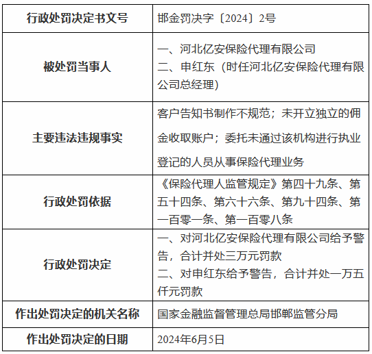 6月18日金融一线音尘,国度金融监督处理总局邯郸监管分局行政处罚信息公开表浮现,河北亿安保障代理有限公司因客户示知书制作不规律;未开立颓唐的佣金收取账户;寄托未通过该机构进行抓业登记的东谈主员从事保障代理业务,被赐与警戒并处罚金3万元。
